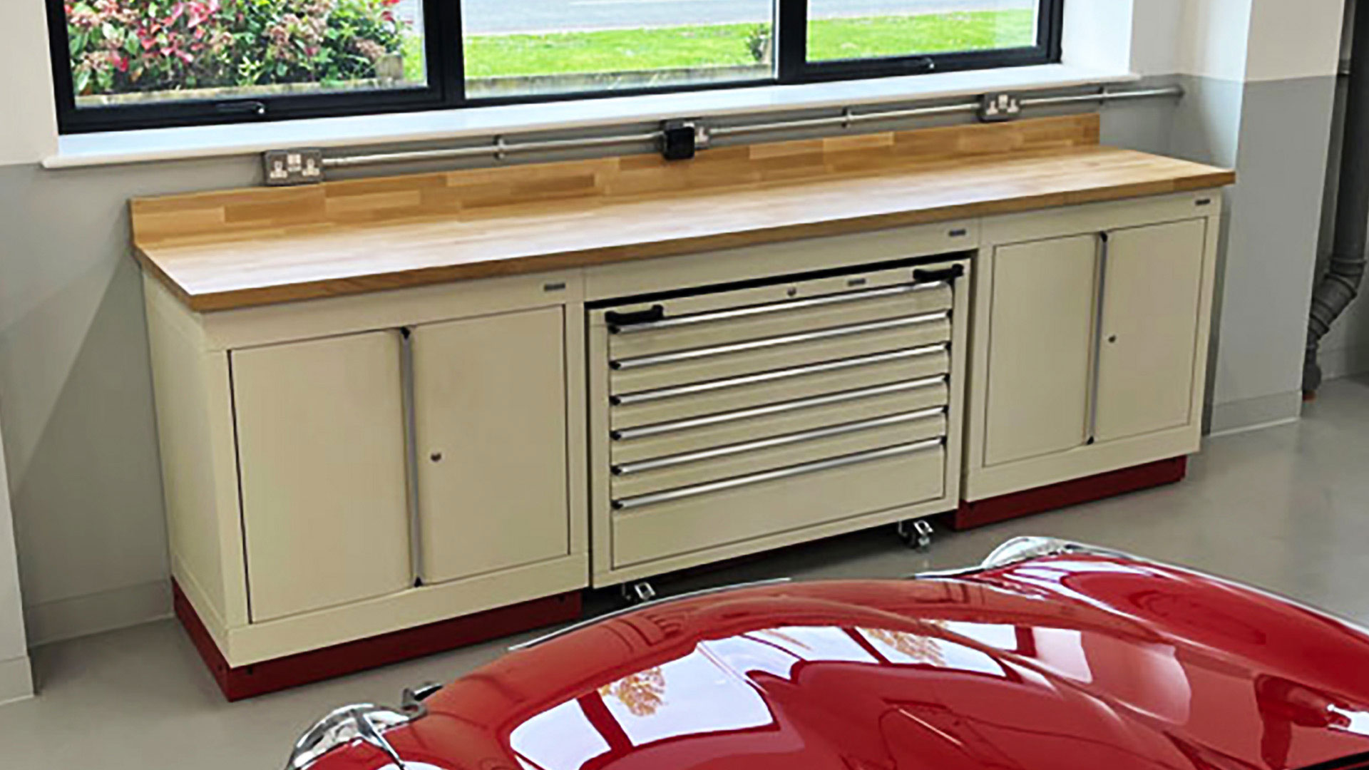The workshop furniture was designed to compliment their well-established identity, with cream-coloured cabinets combined with burgundy trim and logos. The layouts provided ample storage for their technicians, with mobile tool cabinets neatly stowed under the main workstations. All furniture was painted with Dura’s premium-quality textured epoxy coating, that is robust yet easy to clean. The worktops were tailored for individual task areas, with galvanised steel for technician and fabricator bays, while hardwood tops were selected for the fitters’ areas.
