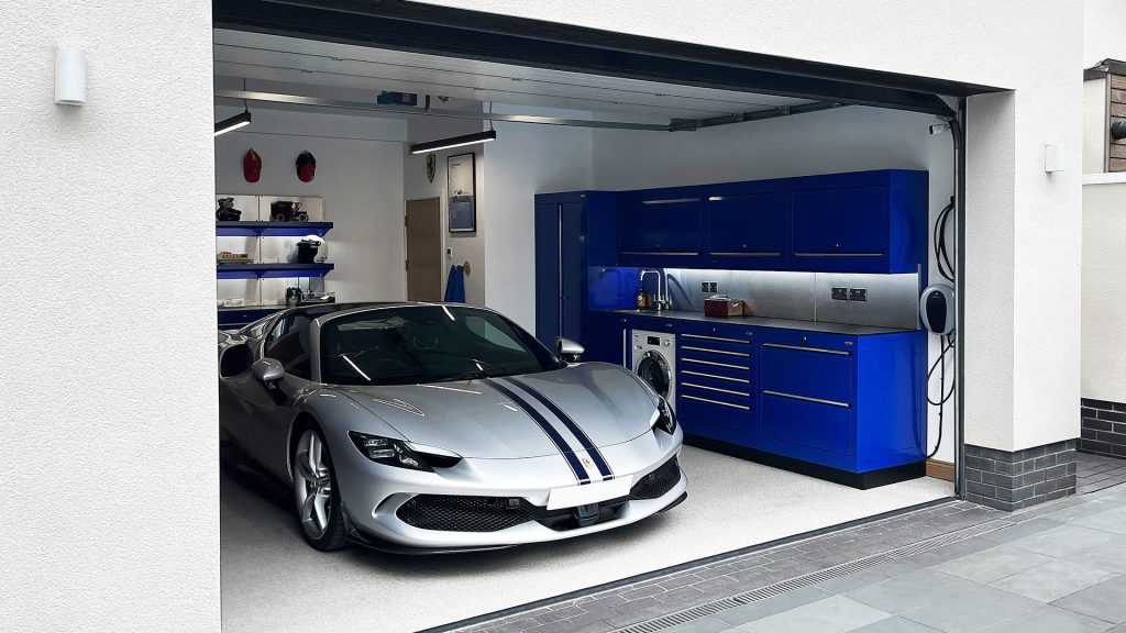 At the rear of the garage, a bespoke showcase features three low-level storage units, with custom shelving, stainless steel back panels, and lighting to highlight the customer’s memorabilia—perfectly complementing their Ferrari 296 GTS. To refine the design, we provided colour samples and a photo-realistic 3D render, helping the customer visualise and fine-tune the space.