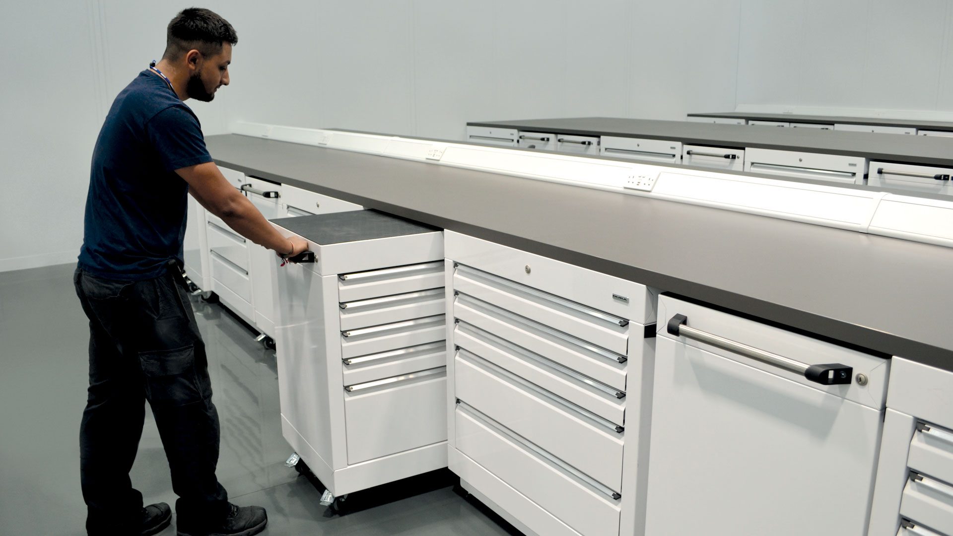 Durante un extenso periodo de consulta, Dura colaboró estrechamente con el jefe del equipo de mantenimiento y sus 38 ingenieros para comprender plenamente sus necesidades para el nuevo taller, así como para satisfacer las necesidades generales de la empresa. El diseño incluyó estaciones de trabajo individuales con cajoneras fijas y móviles, además de espacio de almacenamiento adicional para artículos de mayor tamaño. También se contempló una superficie de trabajo continua con tomas de corriente integradas, para ofrecer una solución limpia y organizada, fundamental para el proyecto.