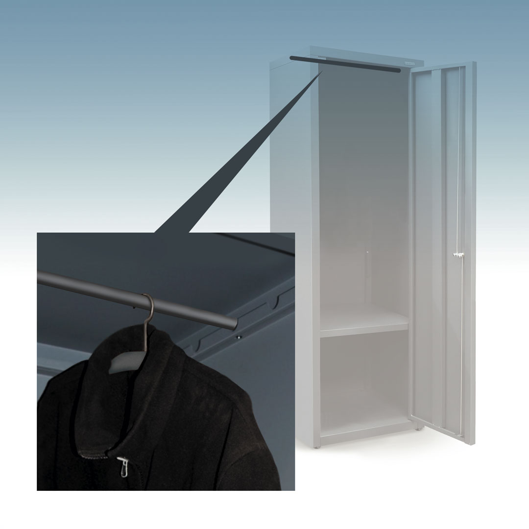 Designed for versatility, the coat rail adds a practical hanging solution to your 400 Series tall cupboard. It can be securely fitted using the integrated hanger mounts or mounted beneath a shelf for more flexible storage.