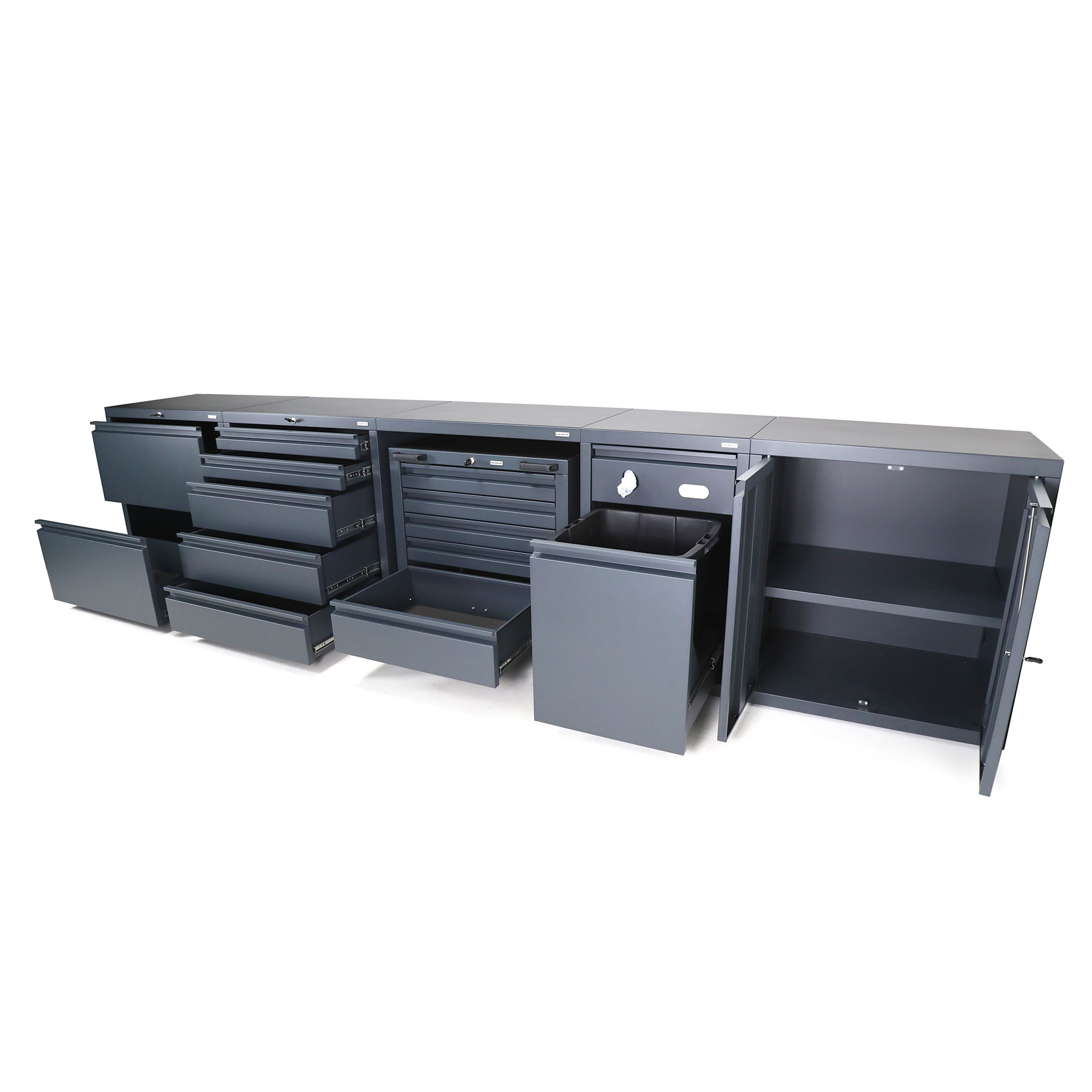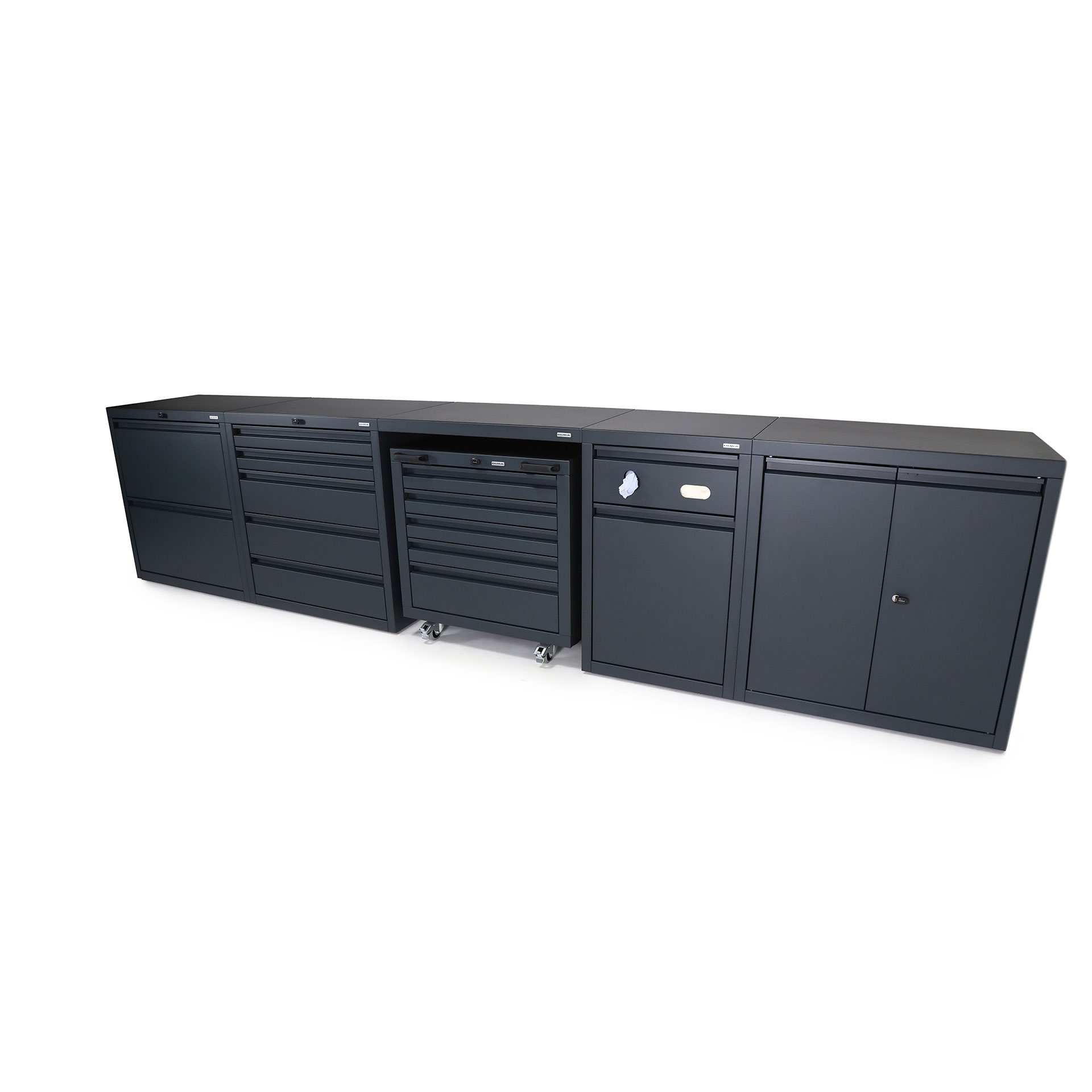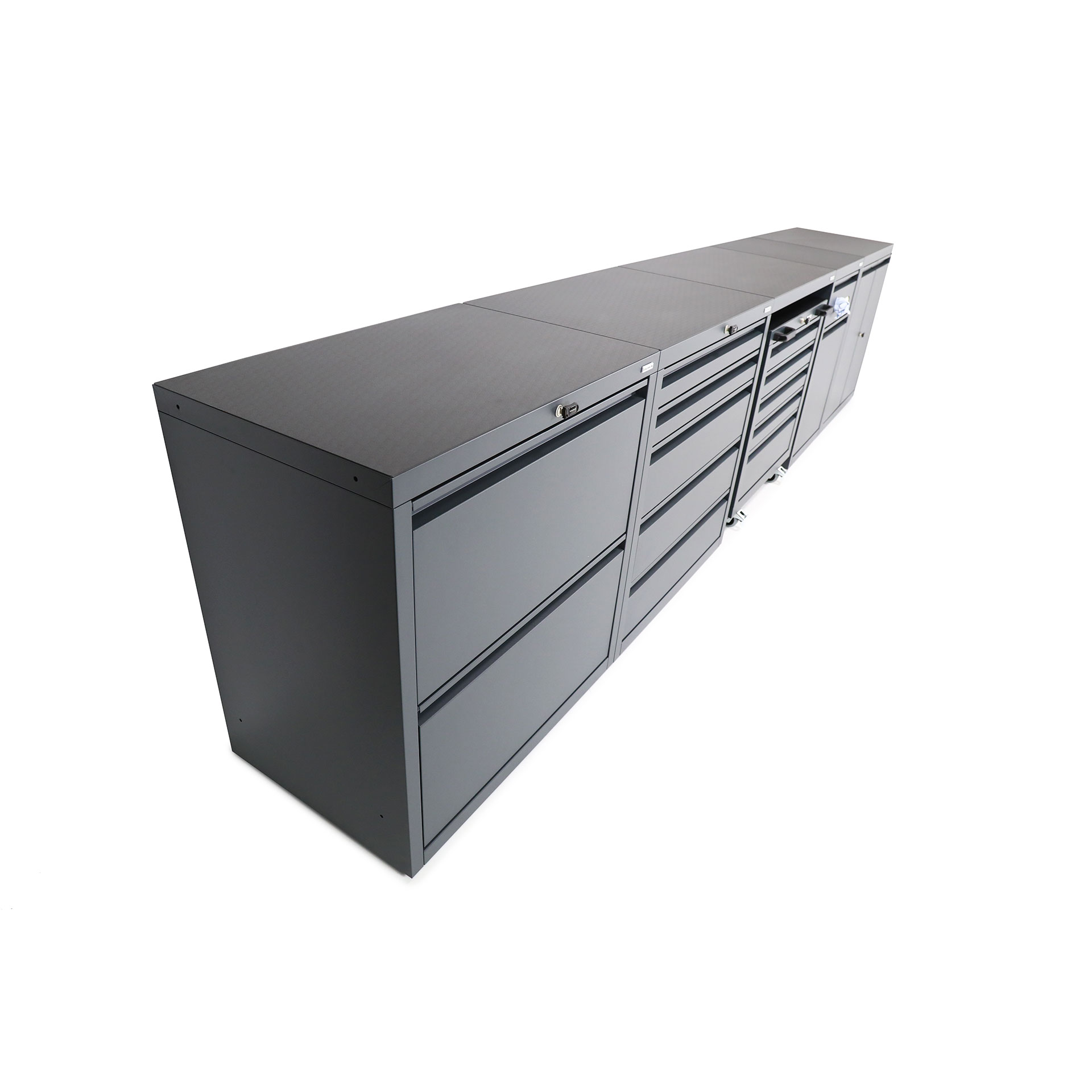 Low-level package three maximises storage and utility, creating an expansive 4.2m of worksurface within just W 4200 x D 600 x H 950 mm of space. This package also includes a mobile drawer unit to transport your tools to the task.