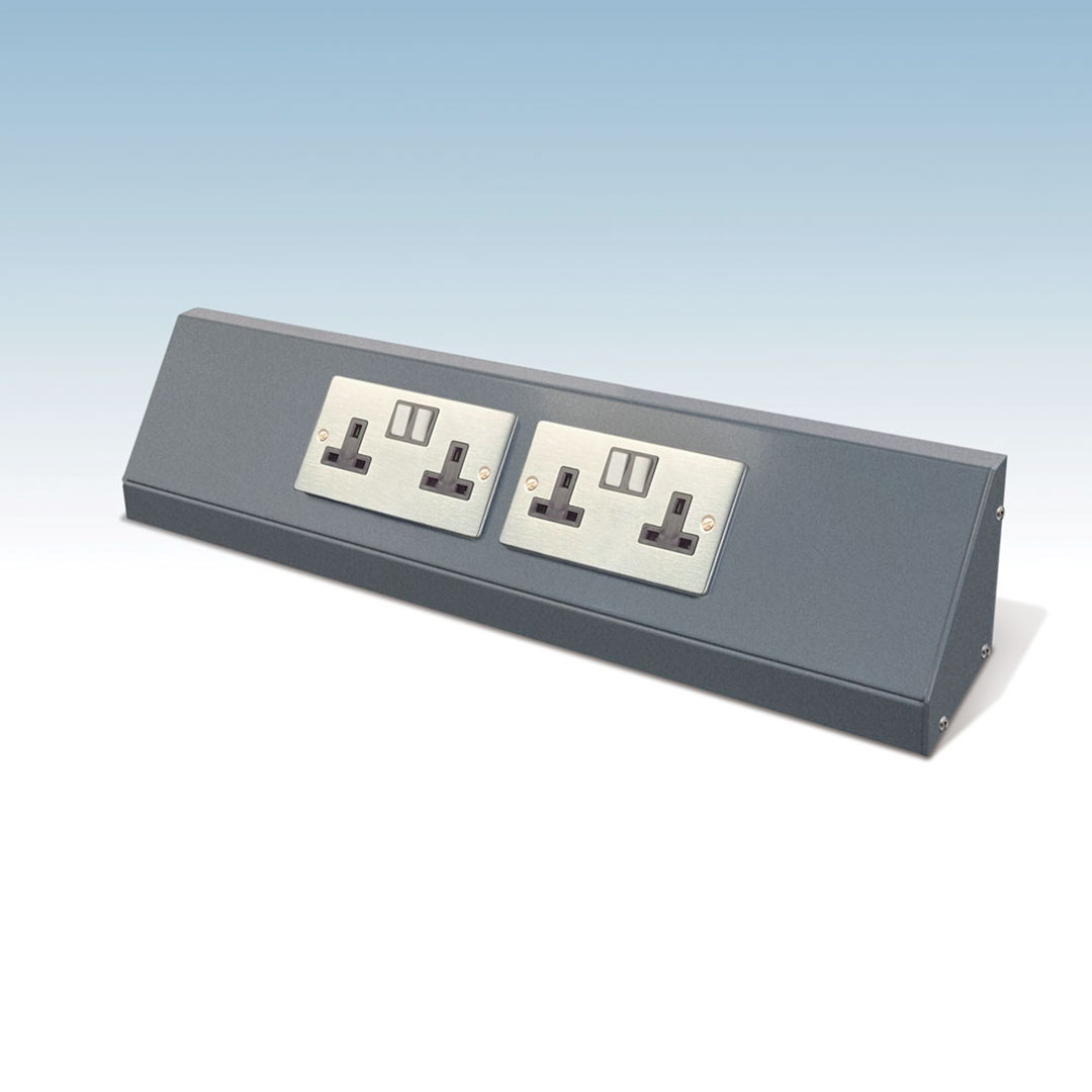 Available in 600mm, 900mm and 1200mm widths to match corresponding base units, each section includes two brushed stainless steel UK double sockets and two matching end plates for a clean, professional finish.