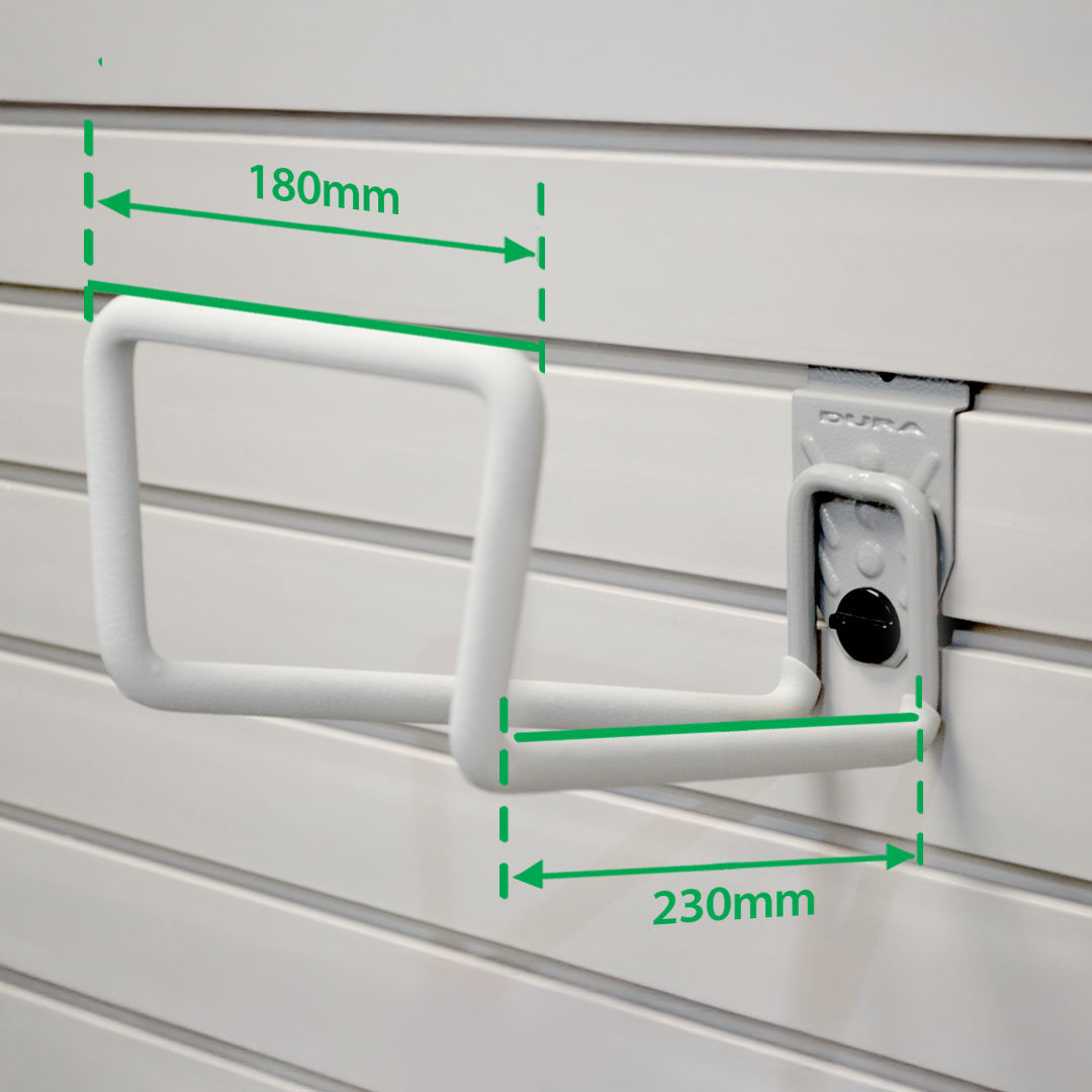 This 180mm-wide utility hook features a durable rubberised light grey coating, making it perfect for securely holding bulky items like hose reels or stepladders. Built from strong metal, it’s designed to withstand heavy use without compromising your StorePanel™ wall’s sleek look.