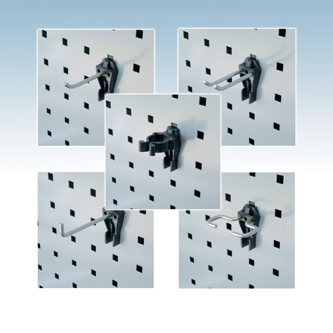 Choose from a variety of individual hook types and holders to hang everything from hand tools and power drills to pipes and hammers. Each accessory is engineered for a secure fit and clean, practical organisation.